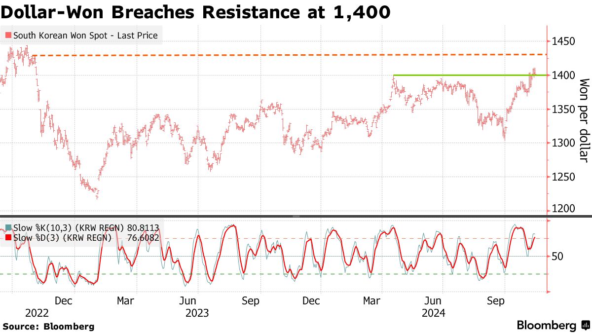 上周,韩元兑美元汇率跌至1,410.70,为2022年11月以来的最低点,市场担心当选美国总统的特朗普将对韩国商品征收高额关税。瑞穗证券公司预测,韩元可能再跌0.7%,这将加上今年7.7%的跌幅。