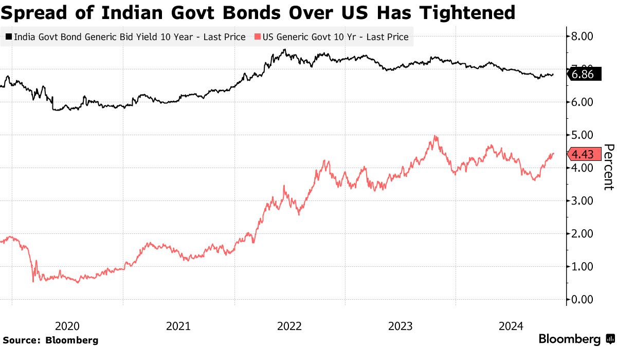 印度10年期债券相对于类似到期的美国国债的额外收益在周一缩小至约243个基点,接近一年多以来的最低水平。