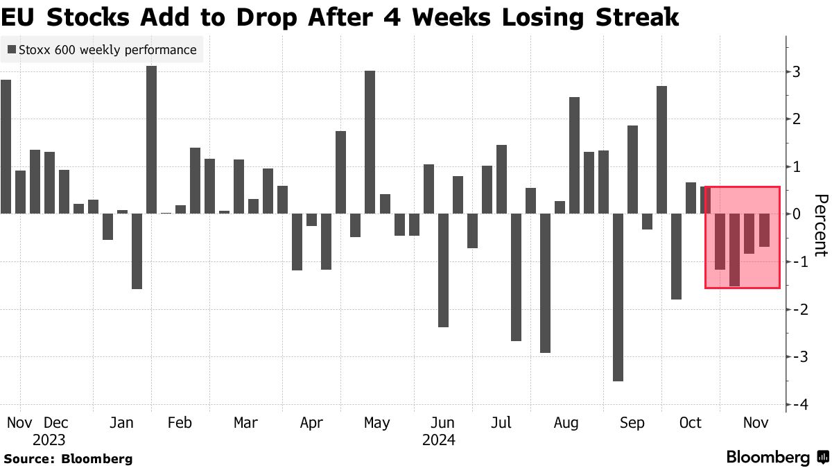 “对欧洲资产——包括股票、利率和外汇——的负面情绪非常广泛。经济活动正在放缓,盈利预期被下调,中国需求——欧洲经济的关键驱动力——也在减缓。提议的关税使已经困难的局面更加雪上加霜,”State Street Global Markets的高级多资产策略师Marija Veitmane表示。