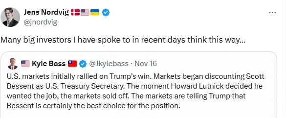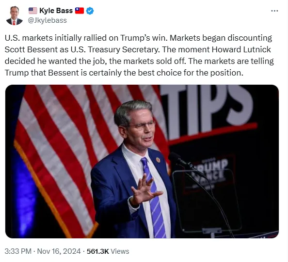 - 唐纳德·特朗普对财政部长的搜索在周末陷入混乱,竞争者们争夺支持。埃隆·马斯克在支持霍华德·卢特尼担任该职位后,与特朗普考虑的人选对冲基金经理斯科特·贝森特进行了交谈。