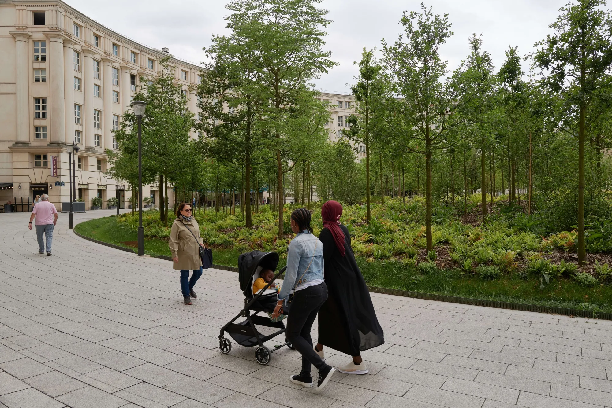 人们走过卡塔隆广场的城市森林。增强城市的树冠是其新的气候适应计划的一部分。