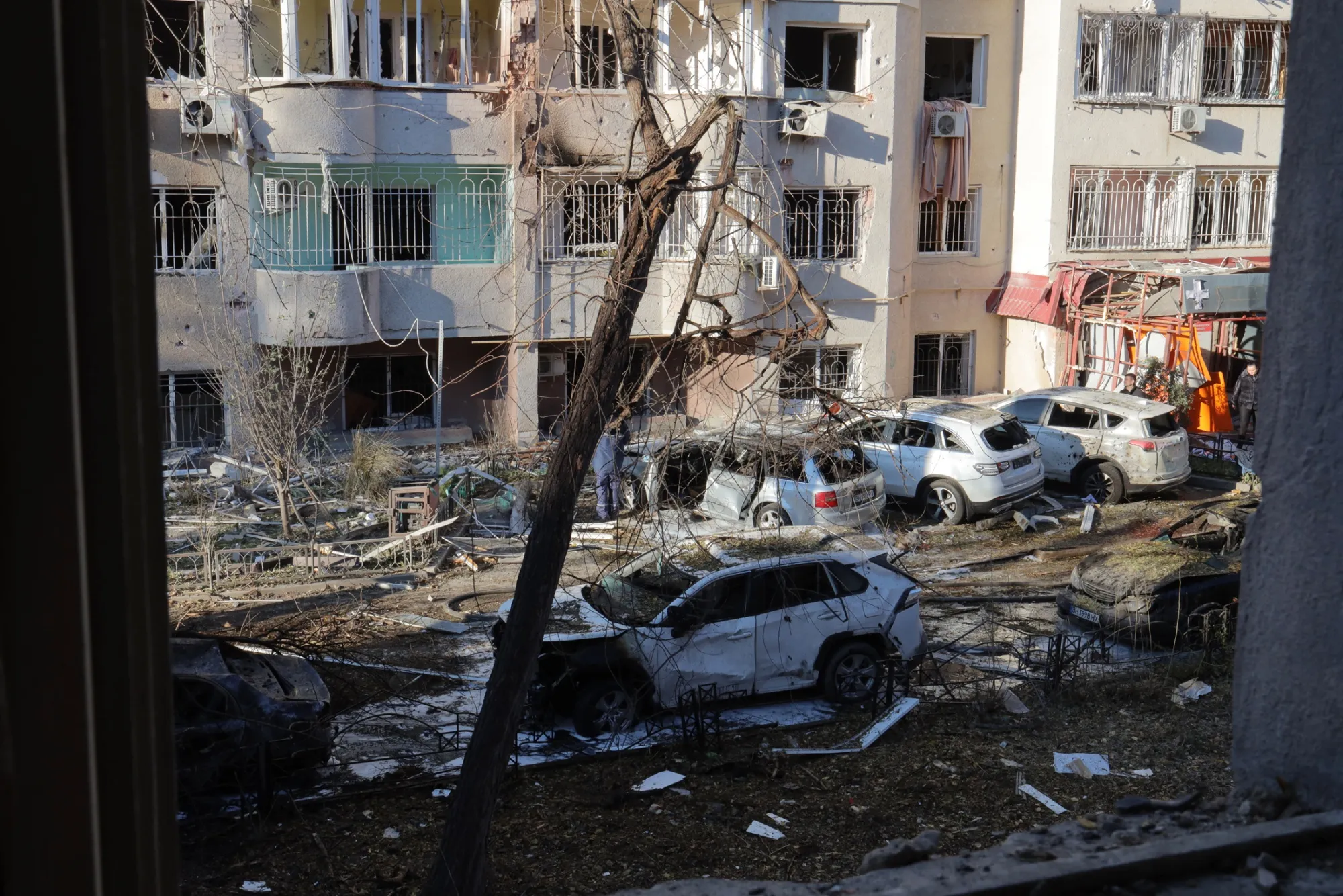 在乌克兰敖德萨,俄罗斯袭击后被毁的车辆和受损的建筑,时间为11月18日。