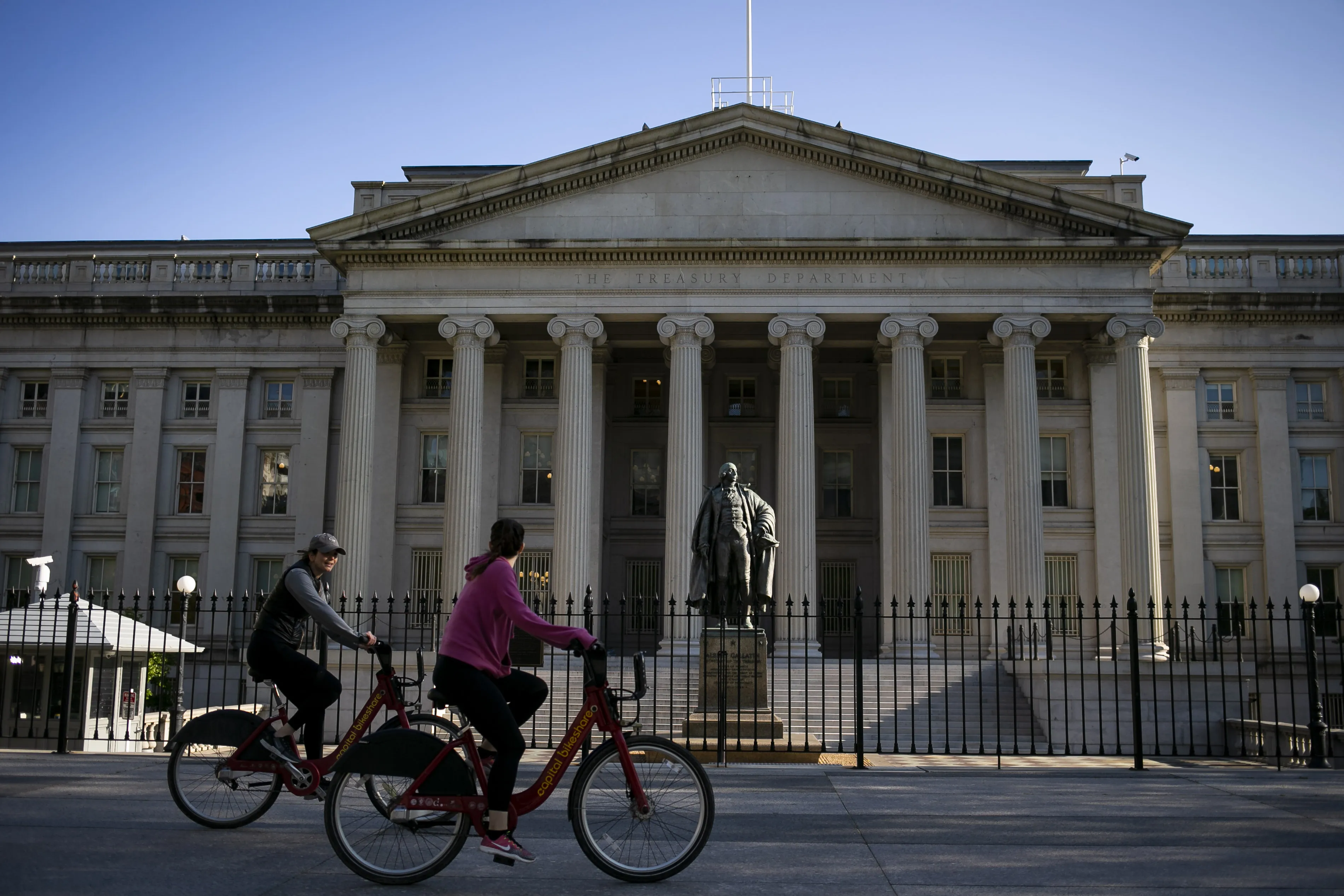 骑自行车的人经过华盛顿特区的美国财政部大楼。
