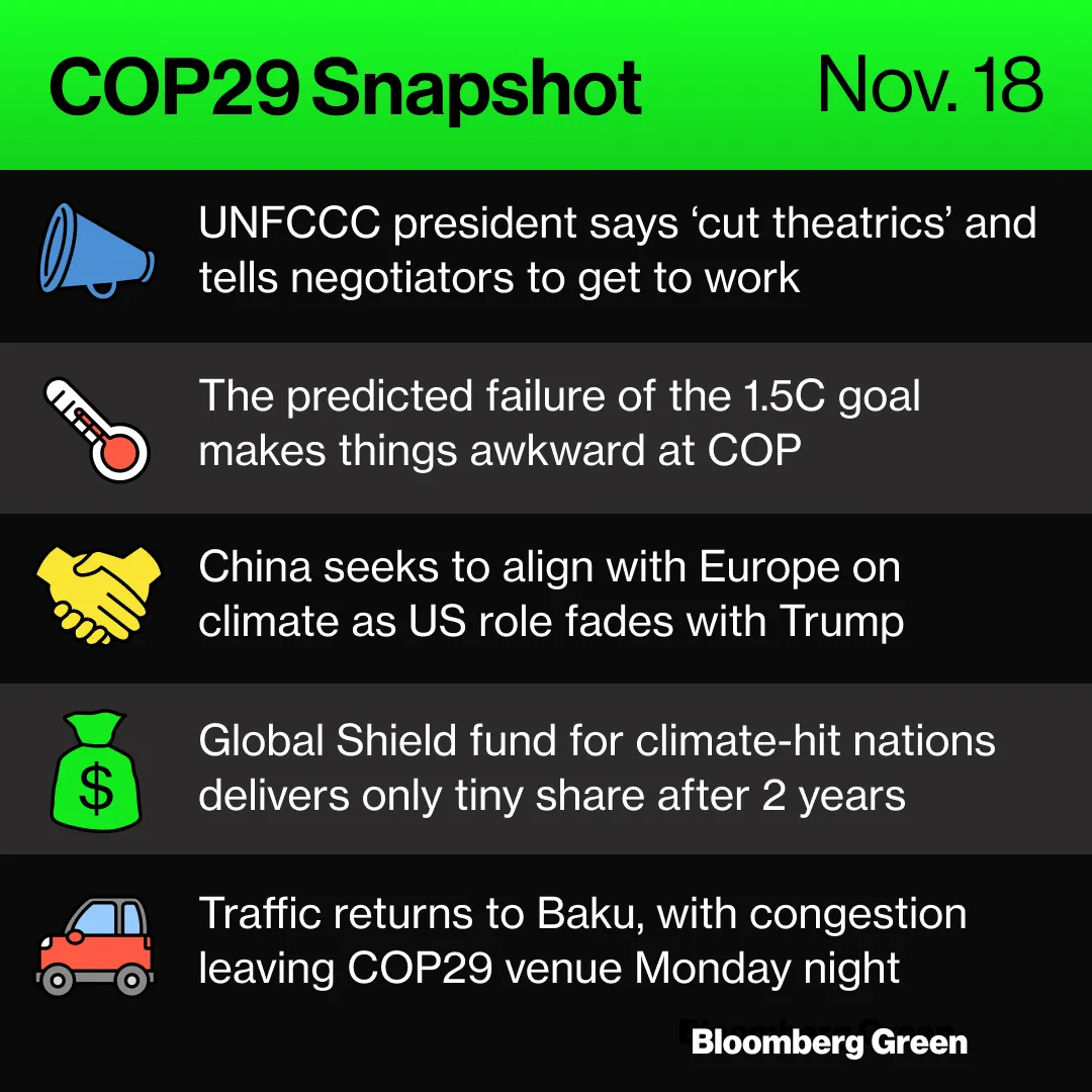 2024年11月11日,阿塞拜疆巴库的COP29气候会议上的中国展馆。联合国气候变化会议COP29将持续到11月22日。摄影师:安德烈·鲁达科夫/彭博社 晚上好,来自巴库。在过去的一周里,我们听到了很多人对中国在未来气候谈判中可能发挥的作用发表看法。今天我们终于得到了中国对此的观点。你可以 阅读这个故事 — 以及我们所有的COP29报道 — 在 Bloomberg.com 上免费阅读。