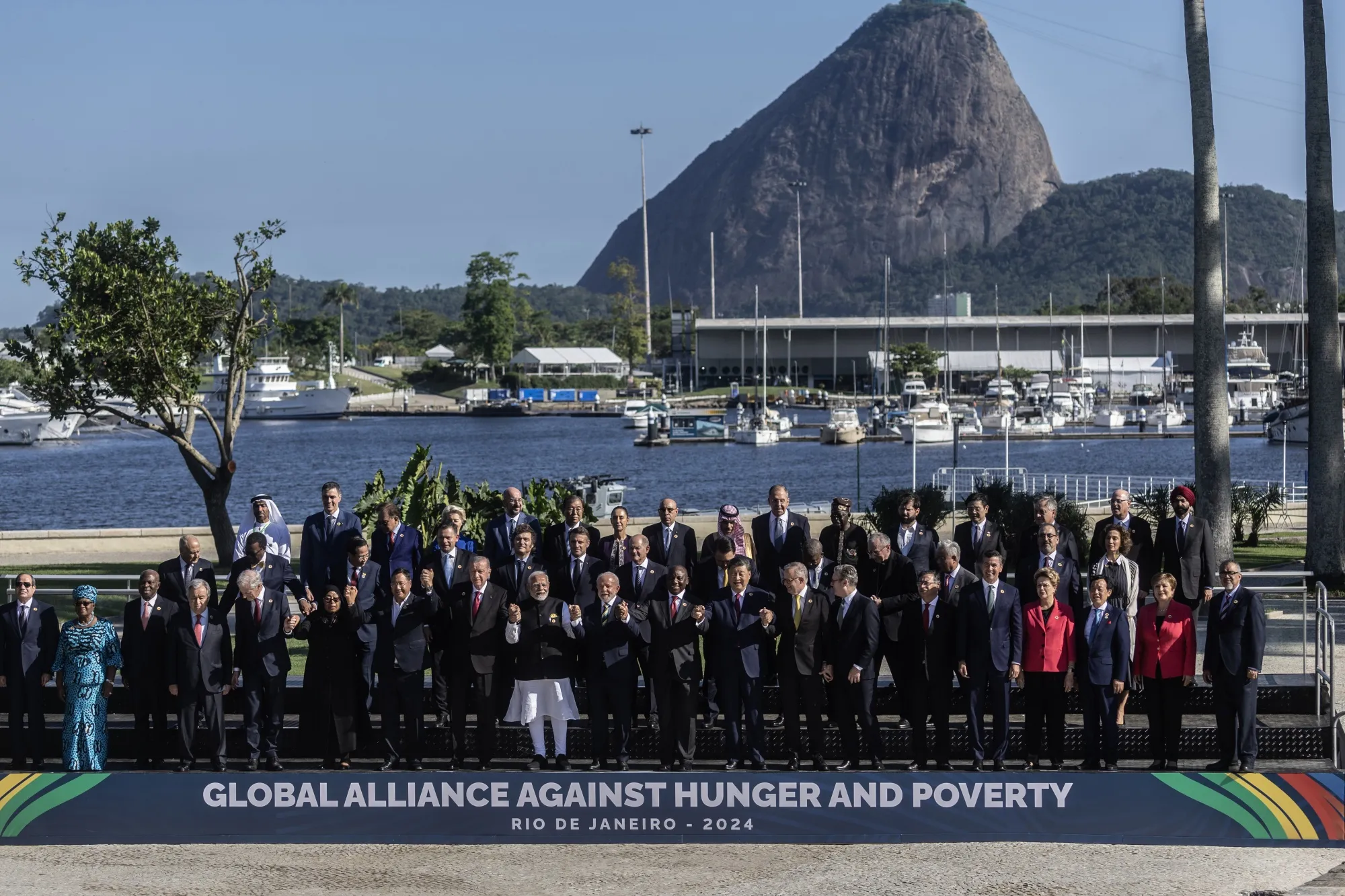 世界领导人在2024年11月18日于巴西里约热内卢举行的二十国集团领导人峰会上合影留念。摄影师:达多·加尔迪耶里/彭博社在阳光明媚、蓝天清澈的背景下,里约标志性的糖面包山映衬着,二十国集团领导人聚集在一起拍摄他们的“家庭照片”。唯一的问题是:美国总统乔·拜登缺席。