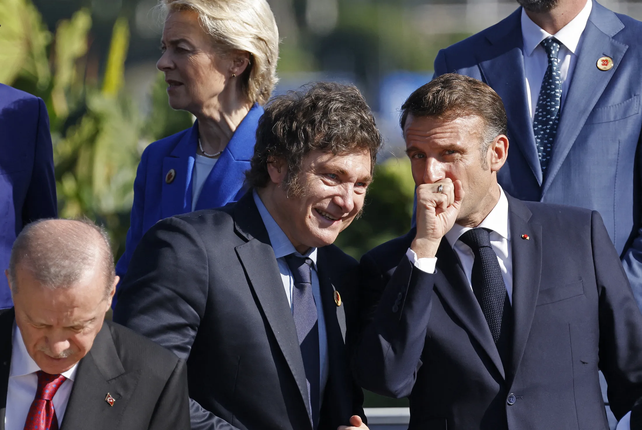哈维尔·米莱与埃马纽埃尔·马克龙交谈,他们在2024年11月18日于巴西里约热内卢的G-20领导人会议上合影。摄影师:卢多维克·马林/法新社/盖蒂图片社拉夫罗夫安全地待在后面,和他的沙特同行在一起。