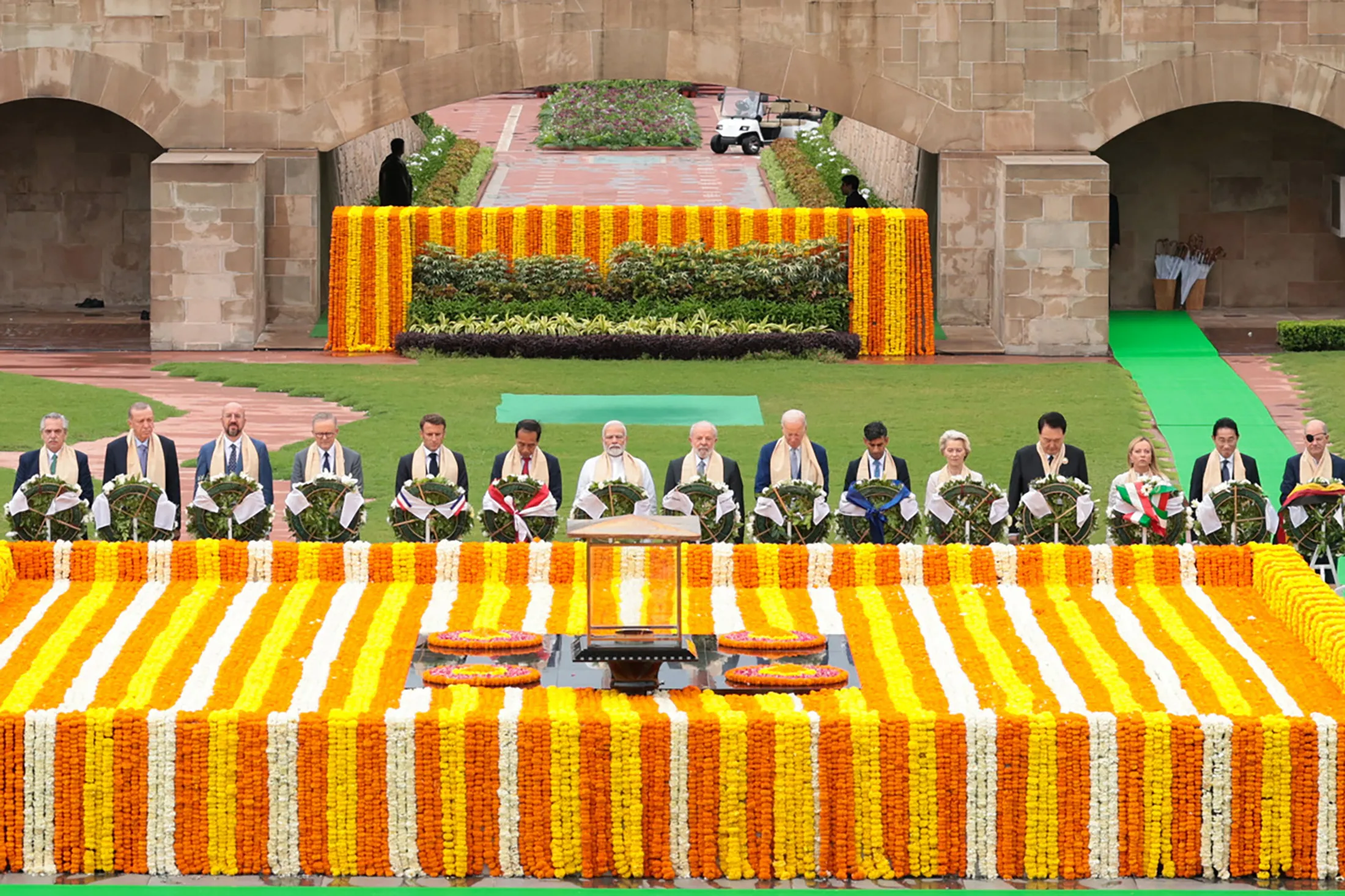 印度总理纳伦德拉·莫迪(中)与世界领导人在2023年G-20峰会期间,在新德里拉杰·甘特的甘地纪念碑前致敬。来源:法新社/盖蒂图片社自那时以来,局势有所变化。