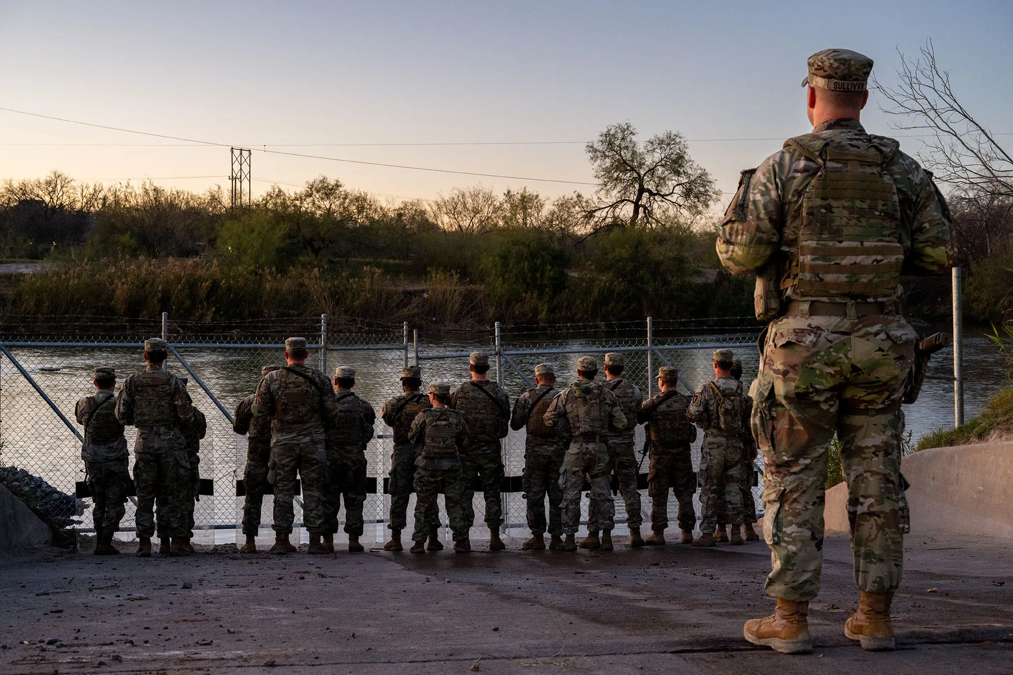 国民警卫队士兵在德克萨斯州鹰通的谢尔比公园里守卫在里奥格兰德河岸边。