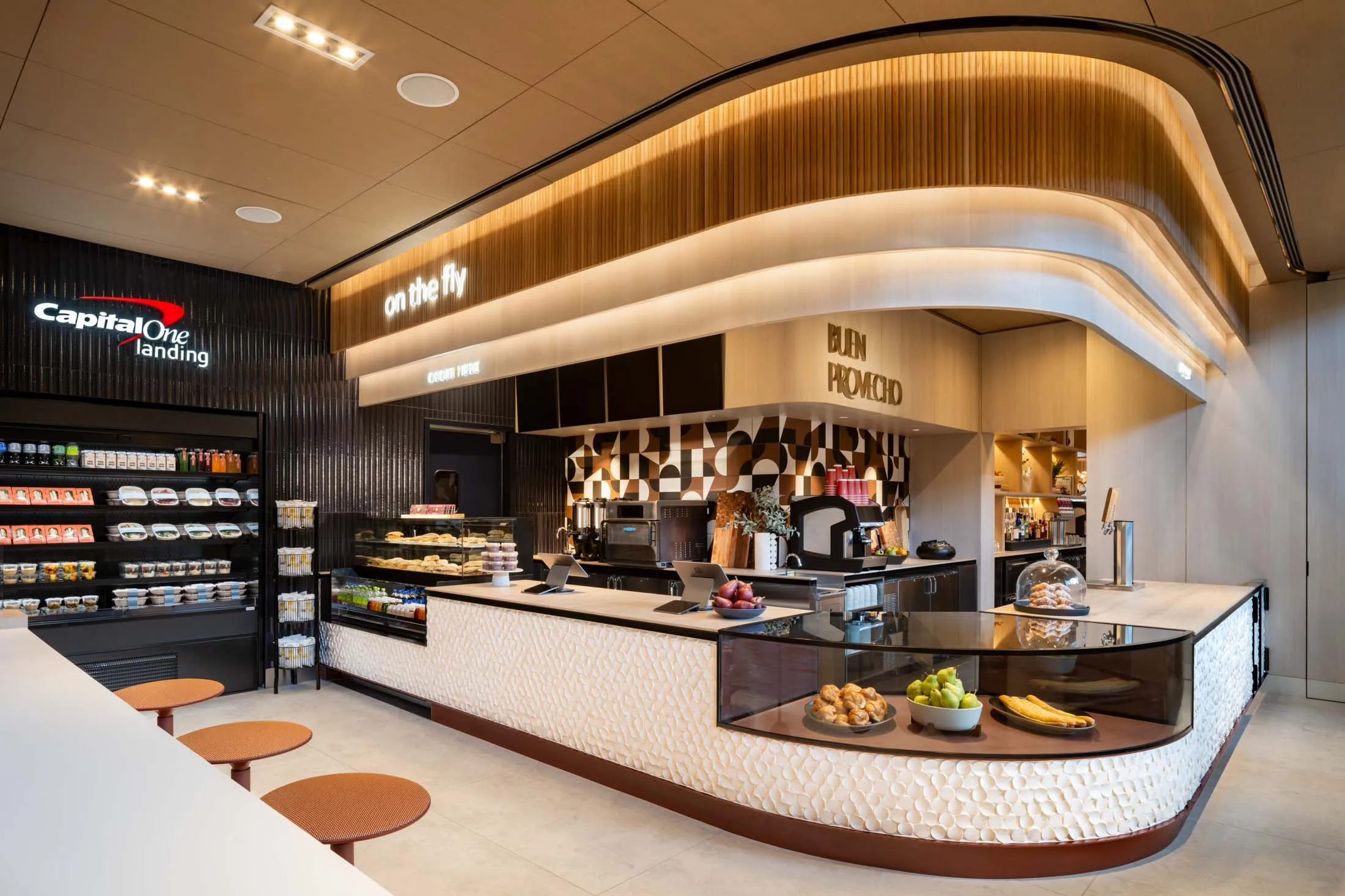 Capital One Landing的中央餐厅。摄影师:Ron Blunt在安德烈斯的 Zaytinya在华盛顿特区,在周末晚上获得预订意味着需要提前几周计划。在这里,只需在出发航班前最多三小时持有一张Capital One Venture X 或 Venture X Business 卡即可轻松入场。如果您拥有Venture或Spark Miles卡,入场费用为45美元;对于其他人,入场费用为90美元。在一项民主举措中,所有旅客都可以享受邻近的咖啡馆,提供外带选项。