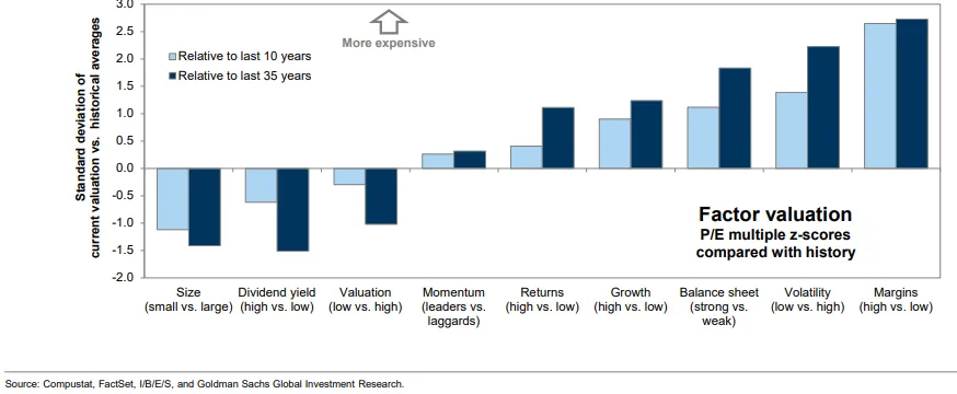 彭博社观点黄金受特朗普、中国和美元国王的摆布乌克兰的盟友正在邀请他们自己的“战略失败”如何在这个感恩节谈论除政治以外的任何事情新加坡租户在2025年可能占据上风大卫·科斯丁,高盛集团公司的首席股票策略师,在以下图表中说明了市场如何向高利润公司的方向移动。它根据一系列指标衡量当前估值的差异。小型股和支付高股息收益率的公司目前比过去35年的平均水平便宜1.5个标准差。与此同时,高利润公司获得的估值远高于历史水平,约为35年标准水平的2.5个标准差。随着这些公司继续带来超出预期的表现并扩大利润,迄今为止对它们的投资得到了很好的回报。很难想象这种情况会持续下去: