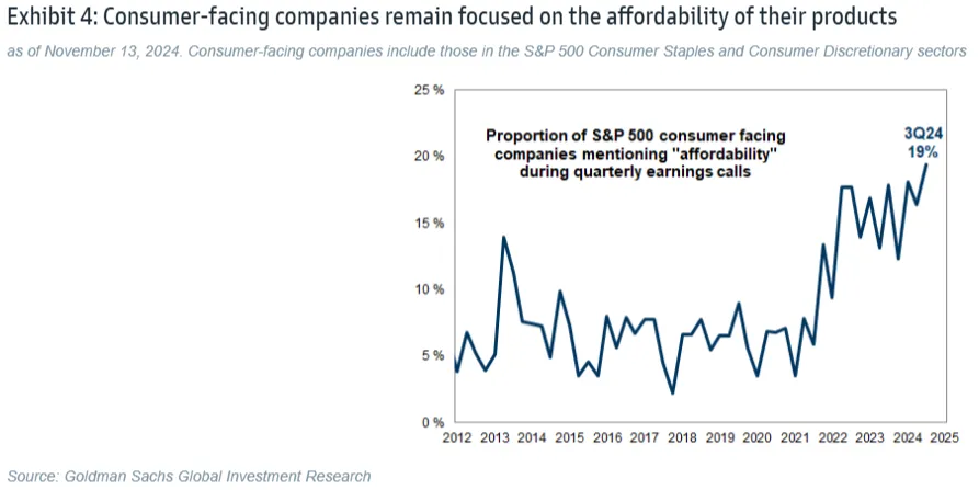 与此同时,高盛的科斯廷继续进行他定期的季度《米色书》,从盈利电话会议和发布中提取引用和轶事,以得出一个主观版本,反映首席执行官们的担忧,类似于美联储的轶事性练习。至少对政策制定者来说,最好的消息是,面向消费者的公司仍然非常担心如何让他们的产品对客户负担得起。他们共同希望将通货膨胀控制在可控范围内。根据高盛的统计,盈利电话会议中提到的可负担性在本季度达到了新高: