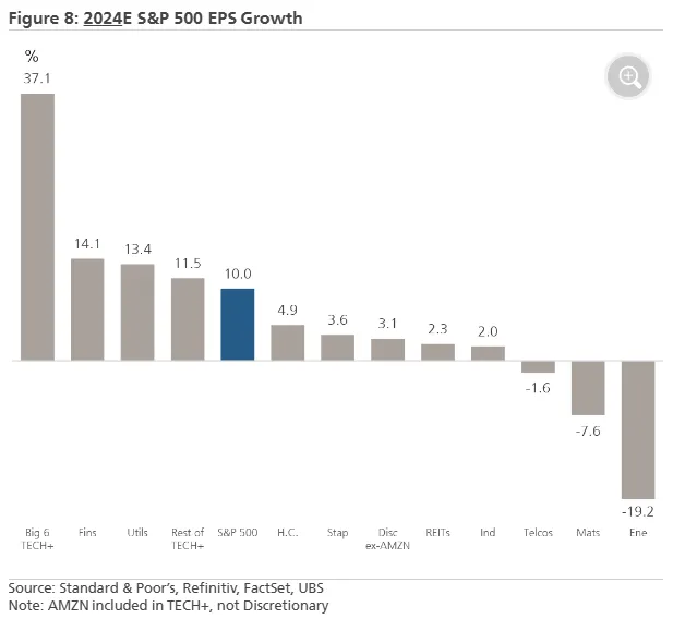 这与美国科技行业有关吗?是的。如果没有其主导的科技平台集团,美国市场将会显得非常不同。为了说明这一点,瑞银集团的乔纳森·戈卢布展示了今年各行业的预期收益增长。他们的“六大科技+”行业包括亚马逊公司,技术上属于消费品可选公司,但排除了特斯拉公司,而这一标准的“七大奇迹”中没有它。这是一幅相当的图景: