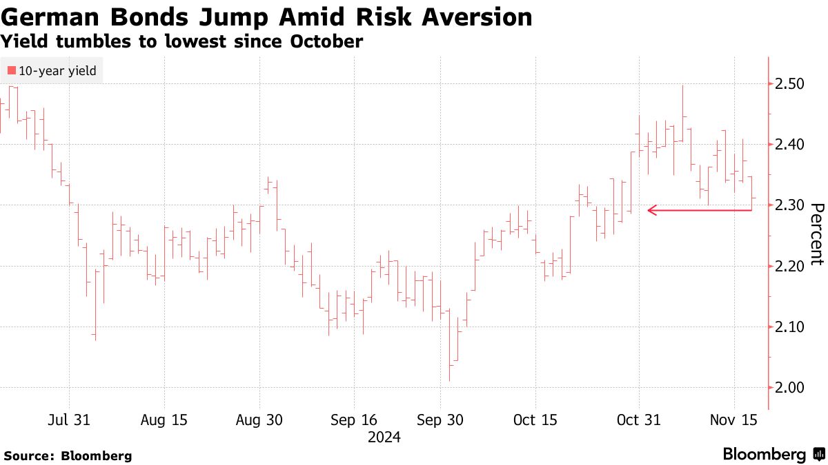 10年期德国债券收益率暴跌最多八个基点,降至2.28%,为10月底以来的最低水平,美国和英国的同行也录得上涨。日元作为传统避险货币表现优异,对美元上涨0.7%。