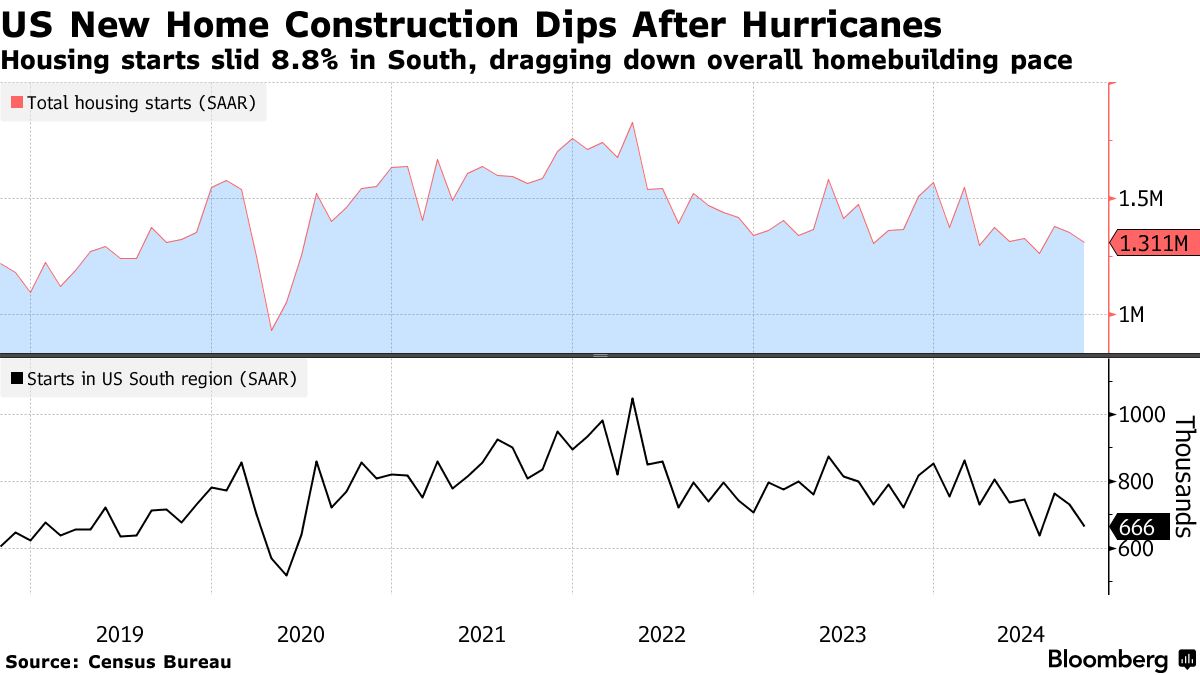 南方的建筑活动占全国住房建设的最大份额,因飓风海伦和米尔顿的影响,该地区的建筑商推迟了项目,建筑活动下降了8.8%。在新房出售数量不断增加和抵押贷款利率接近7%的背景下,住房开工在今年一直难以获得动力。