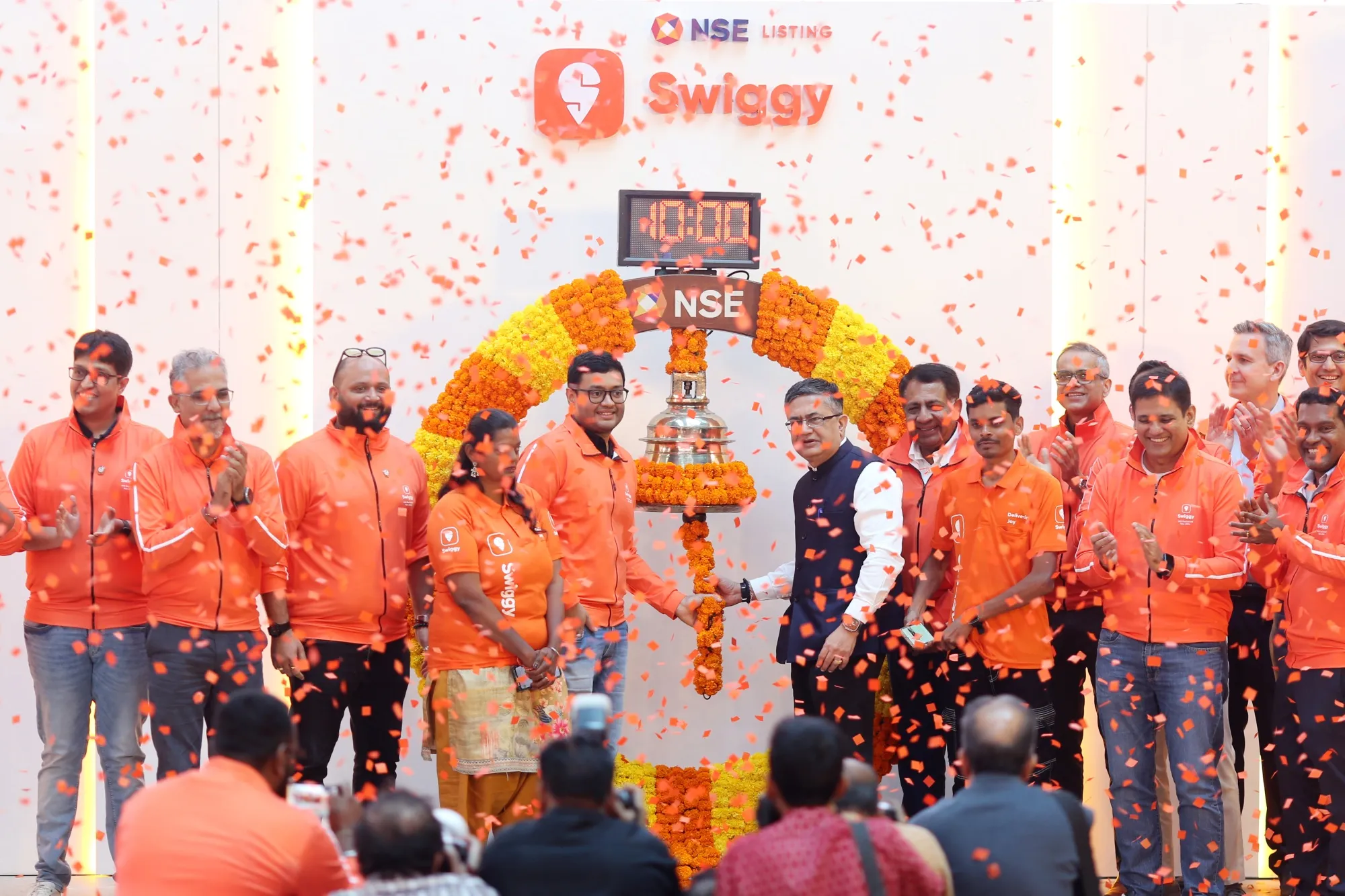 Swiggy 首席执行官 Sriharsha Majety 和印度国家证券交易所首席执行官 Ashish Kumar Chauhan,敲响了钟声