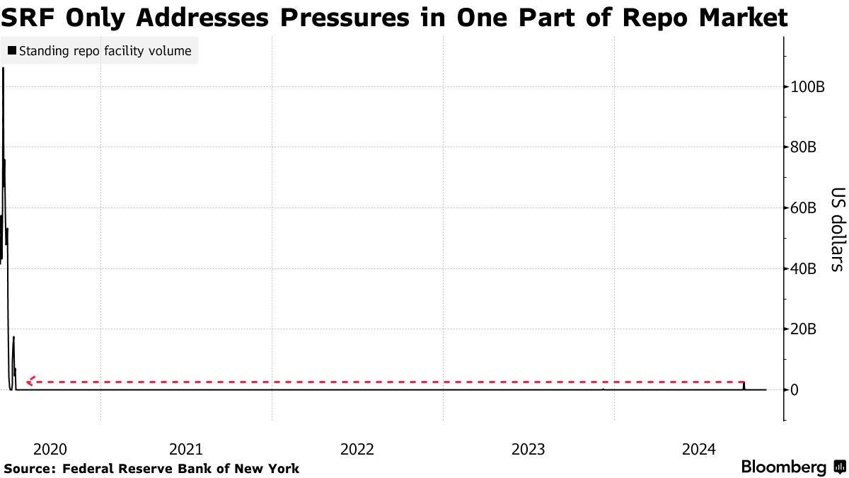 相对较低的使用率和无法控制利率的原因部分在于该计划仅针对更广泛回购市场的一部分。SRF在未清算的客户与交易商三方交易中运作,这是市场中的三个细分之一,纽约联邦储备银行系统公开市场账户经理罗伯托·佩尔利上周表示上周。
