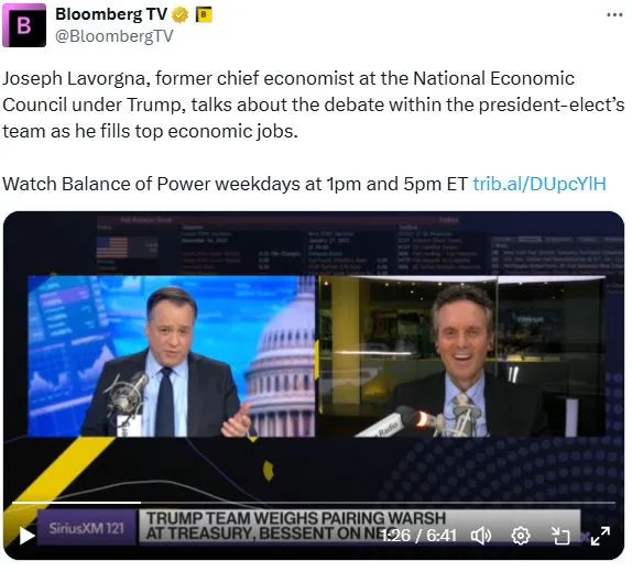 今天在彭博电视台的 权力平衡 上午1点的早间版中,主持人乔·马修和凯莉·莱因兹采访了约瑟夫·拉沃尔尼,他在特朗普第一任期内担任国家经济委员会首席经济学家,讨论当选总统团队在填补顶级经济职位时的辩论。