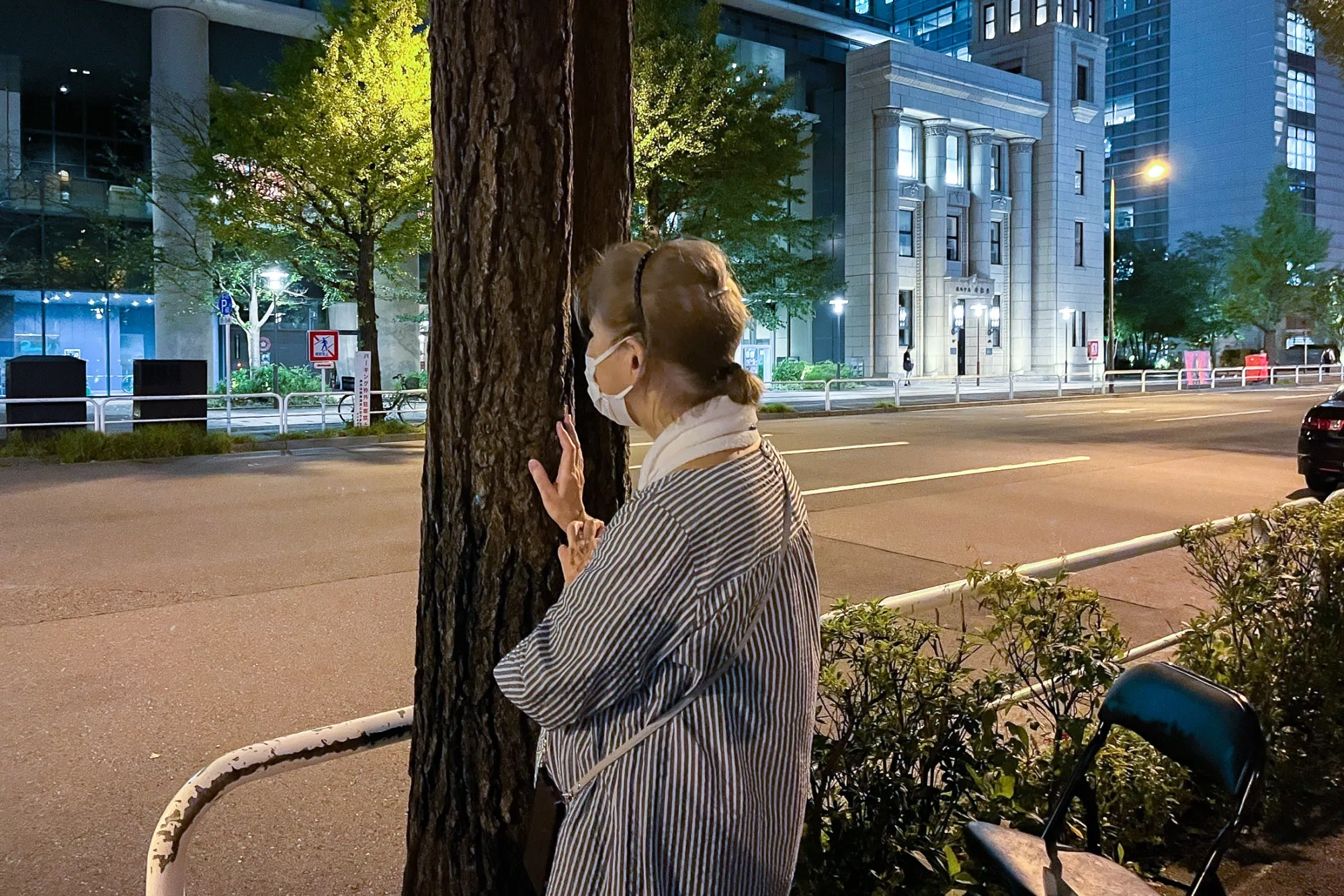 70岁的后藤悦子每晚都会在东京市中心的一条小折叠椅上就坐,以保护大约30棵树免于被砍伐。