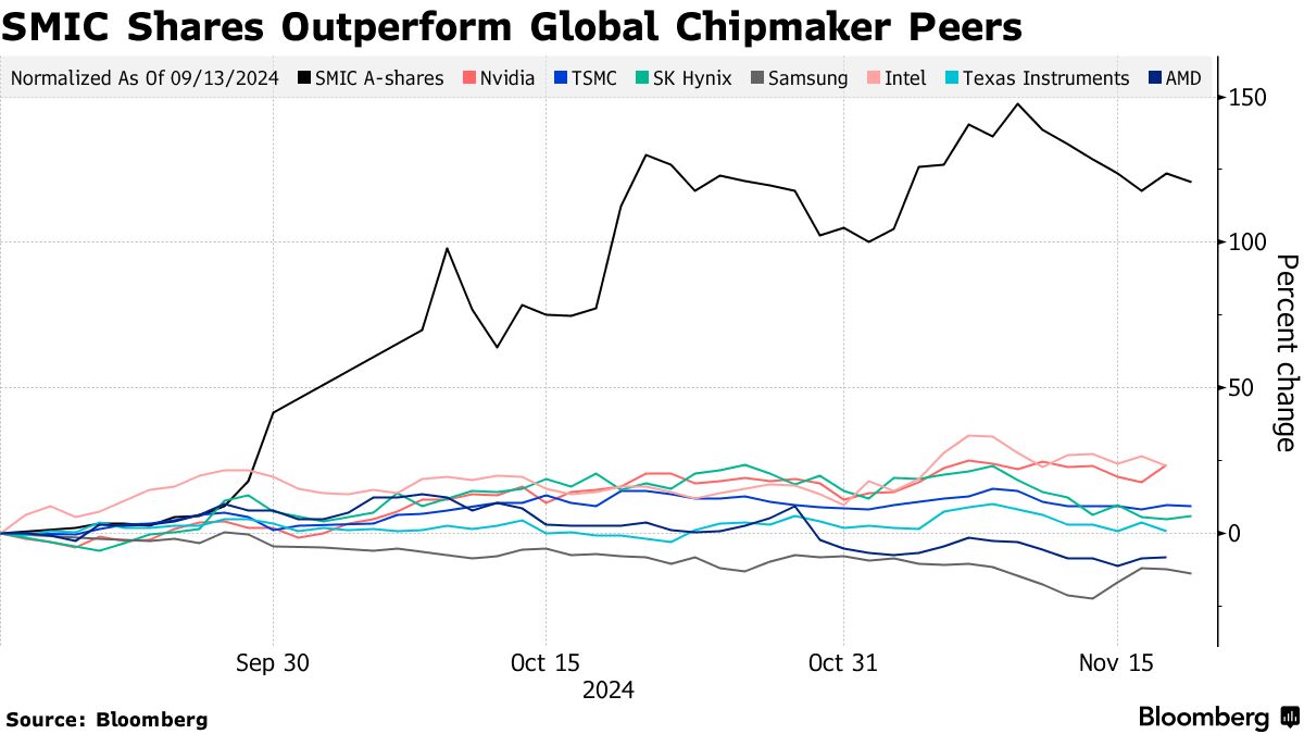 中国最大的外包芯片制造商在上海上市的股票自九月份低点以来上涨了120%,超越了包括英伟达公司和台湾半导体制造公司在内的全球行业公司。大陆股票的表现超过了中芯国际在香港的股票近50个百分点,突显了来自境内中国投资者的更强需求。