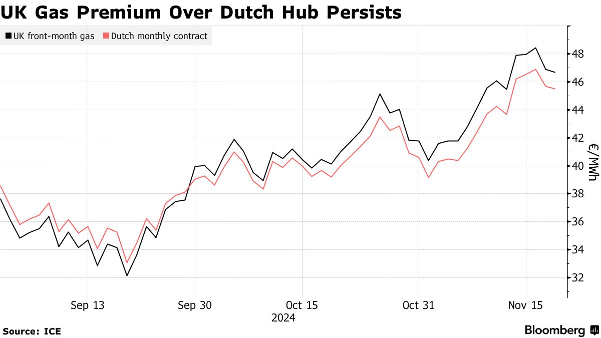 英国的期货在夏季通常比基准价格便宜,但有时在冬季会转为高于阿姆斯特丹交易的天然气价格,以吸引额外供应。今年,由于季节开始时气温低于正常水平以及本月初无风天气,这一趋势得到了加剧。