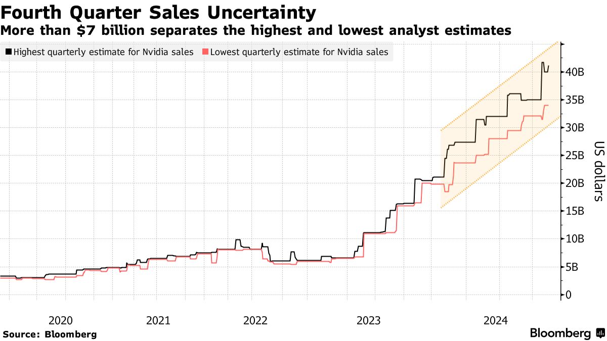 围绕Blackwell的问题导致分析师对截至一月的财政第四季度的预期差异很大。根据彭博社汇编的估计,市场共识为371亿美元——最高和最低预测之间的差距超过70亿美元。Nvidia通常会在发布业绩时提供下个季度的收入指引。