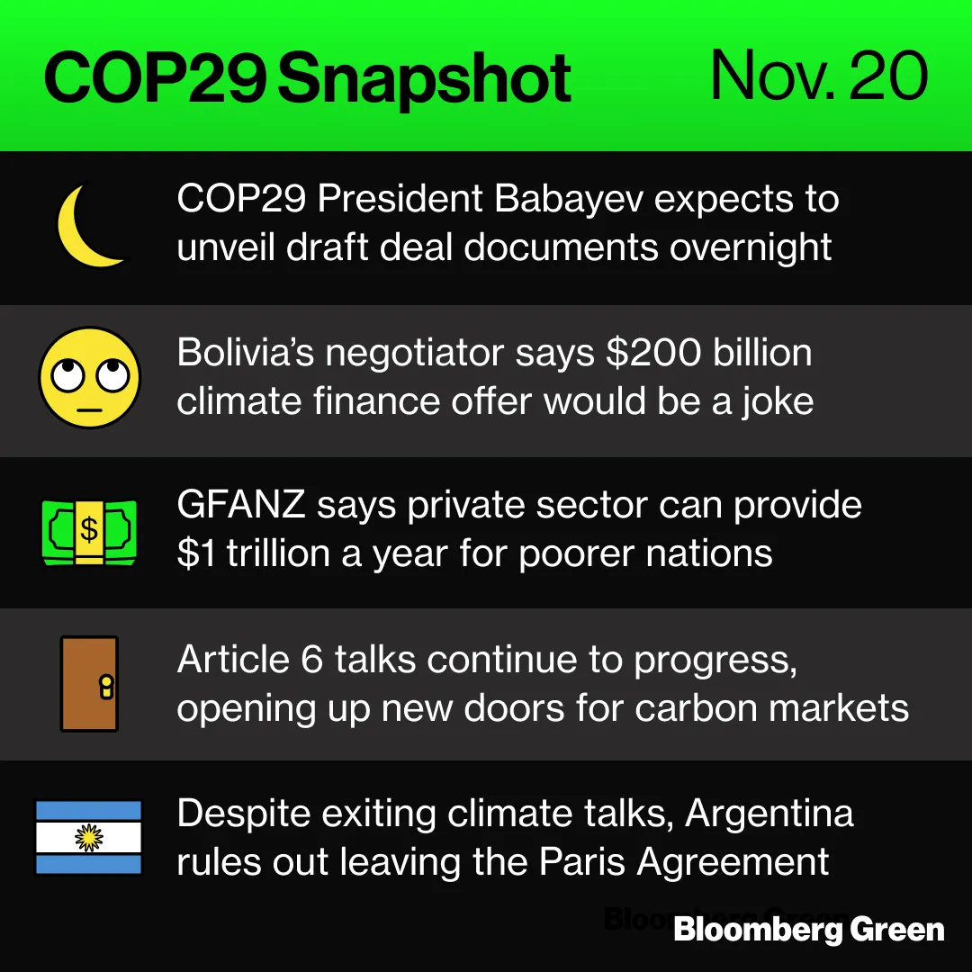 摄影师:霍莉·亚当斯/彭博社 来自巴库的晚上好。我们预计COP主席团将在今晚发布一些 heavily bracketed 的草案文件。明天我们将为您带来关于主要融资协议、碳市场和减缓工作方面的更多信息。同时,请关注我们对COP29的所有报道——整个峰会期间都是免费的——在 Bloomberg.com*。*