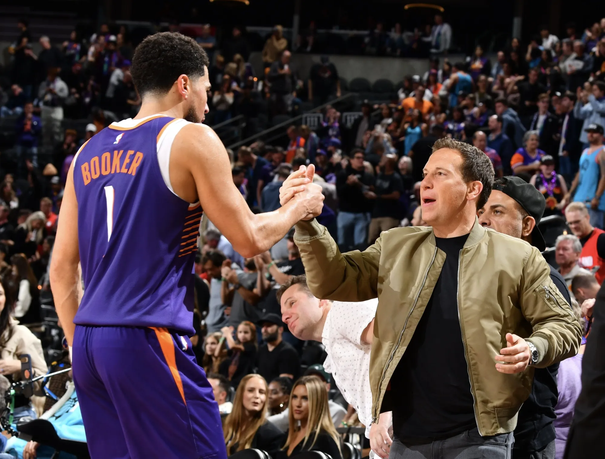 Phoenix Suns的老板Mat Ishbia,右,和Devin Booker。来源:Phoenix SunsRa Ra Room的年会员费包括预订的礼宾服务、代客停车和两个私人餐厅的使用权。会员还可以提前购买NBA和WNBA比赛的门票(Ishbia还拥有Phoenix Mercury,他们与Suns共享这个场馆)、音乐会和其他活动的门票。