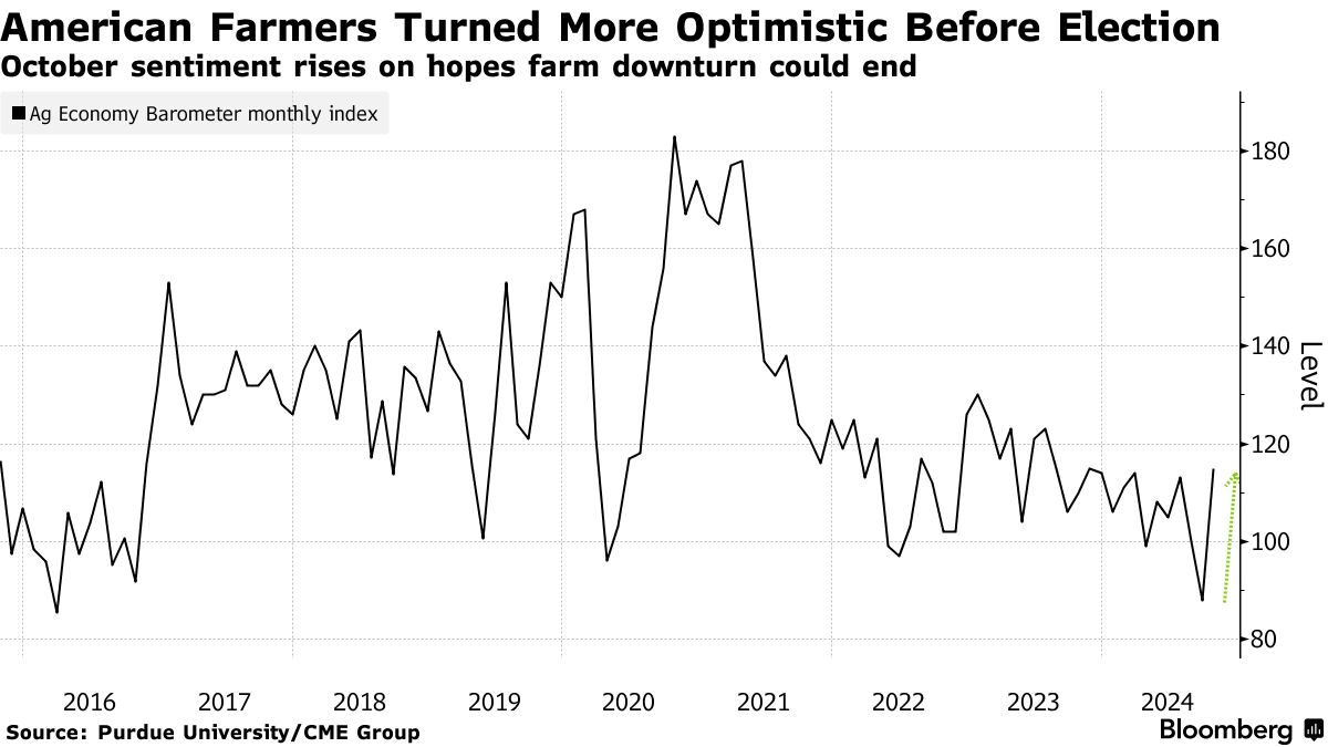 特朗普的选举仍然是一个变数,投资者将关注他第二任期可能如何改变农业格局的线索。他威胁对约翰迪尔在墨西哥开始生产的任何产品征收关税,而加剧的贸易战也可能扰乱农业市场。