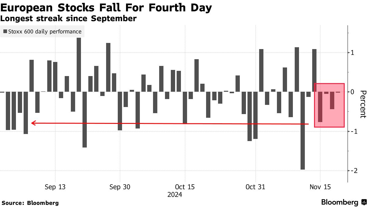 欧洲股票已连续四周下跌,受到美国当选总统唐纳德·特朗普承诺的贸易关税担忧的影响。中国经济放缓和欧洲自身的疲软增长也成为市场的障碍,使得泛欧指数年初至今上涨5%,而标准普尔500指数则上涨24%。