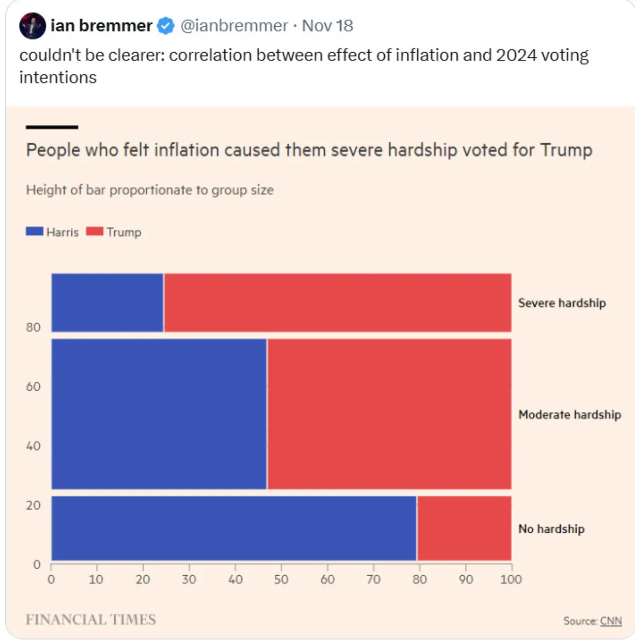 这一切都在推动选举政治和通货膨胀统计数据。在通货膨胀方面,截至十月的租金通货膨胀率高达4.9%。而房主的等价租金在过去12个月中更高,达到了5.2%。如果你是已经拥有房产的婴儿潮一代或X世代,这些都不会影响你的个人通货膨胀。但对于那些仍在租房或希望购房的人来说,这是一件大事。美国总统选举也反映了这一点。出口民调显示,最有可能租房的年轻人和有色人种对民主党最为反感。即使他们更可能投票给民主党,但在2024年,他们的投票倾向却大幅转向了唐纳德·特朗普。相反,最有可能拥有房产并且不受住房通货膨胀影响的老年人,对民主党的反感程度最低。伊恩·布雷默明白这一点!