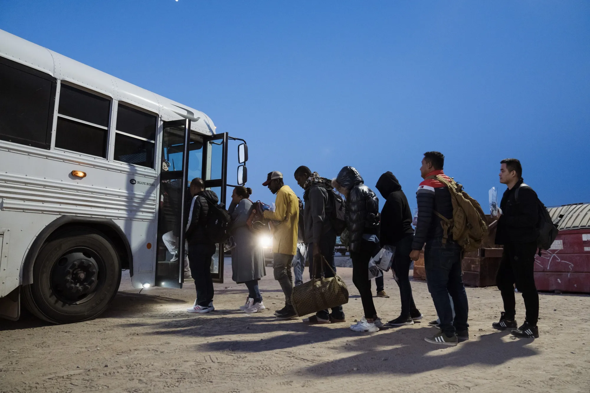 移民在向美国边境巡逻队投降后登上巴士。