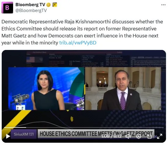今天在彭博电视的 权力平衡 上午1点的早间版中,主持人乔·马修和凯莉·莱因兹采访了民主党众议员拉贾·克里希纳穆尔提,讨论伦理委员会是否应该发布关于盖茨的报告,以及民主党如何在明年少数派中影响众议院。
