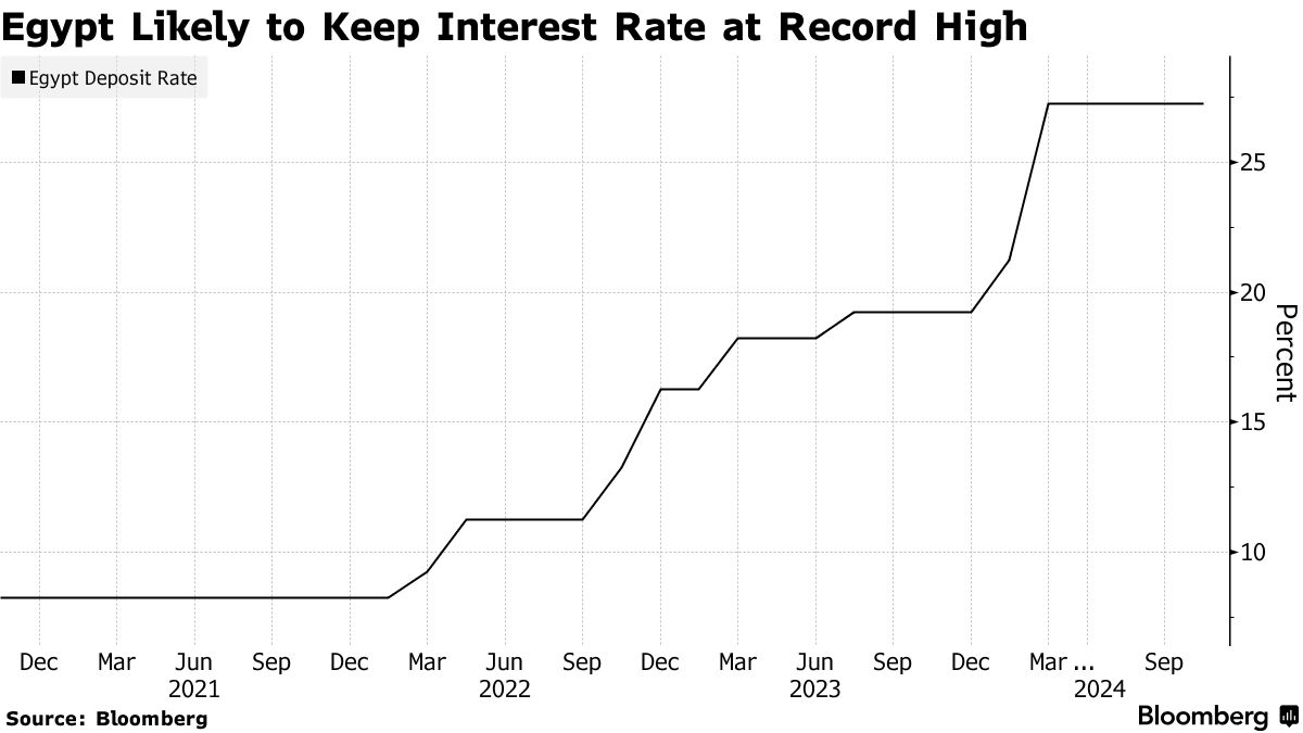 埃及中央银行在9月份表示,其当前利率将保持适当,“直到实现显著和持续的通货膨胀下降。”