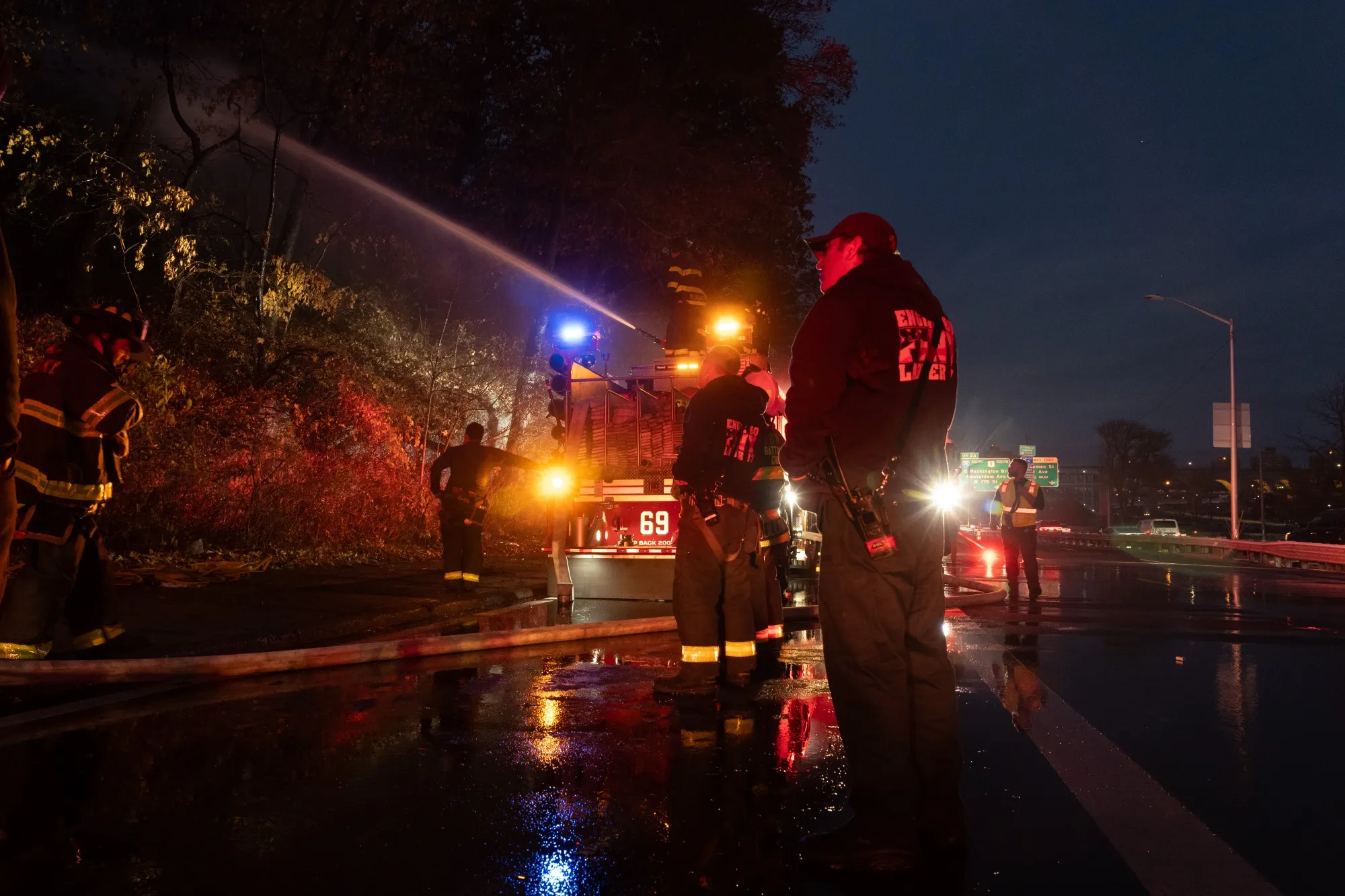 消防员试图扑灭11月19日在曼哈顿哈莱姆河大道旁的灌木火灾。