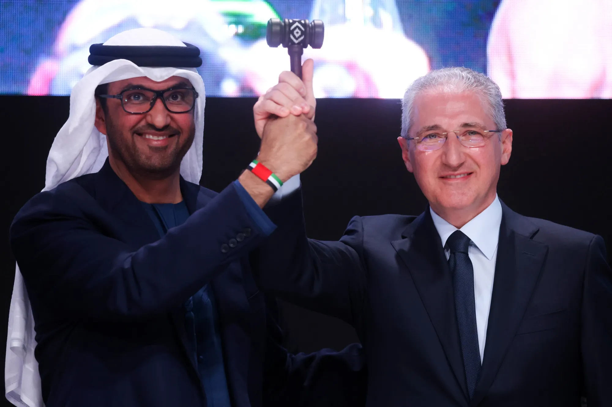 COP28主席苏尔坦·艾哈迈德·阿尔·贾贝尔(左)和COP29主席穆赫塔尔·巴巴耶夫在巴库举行的COP29气候大会开幕式上。