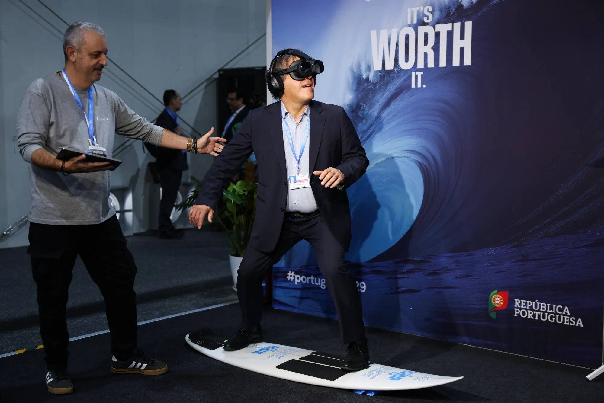 一名与会者在葡萄牙展馆内站在冲浪板上,佩戴着虚拟现实头盔。摄影师:霍莉·亚当斯/彭博社