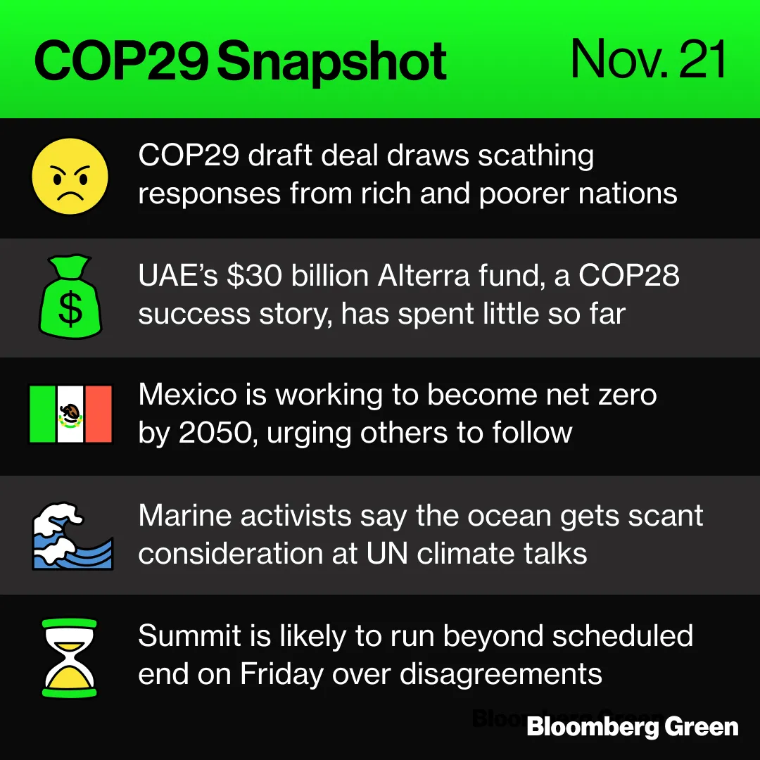 摄影师:霍莉·亚当斯/彭博社 晚上好,来自巴库。有人认为,如果没有人感到快乐,这通常是一个良好妥协的标志。但这显然不适用于这里。我们仍然 距离最终协议还很远,阿塞拜疆各国在资金和减缓方面存在分歧。您可以在 Bloomberg.com 上查看我们所有的COP29报道——这是免费的。