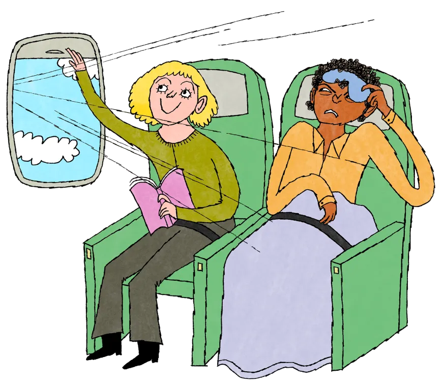 我在达美航空飞行时发生了这个事件,寻求答案,我写信给航空公司,询问它对窗户座位困境是否有官方立场。它回避了。“达美鼓励在机舱内进行礼貌的对话,”一位发言人说。联邦航空管理局和欧洲联盟航空安全局的发言人都告诉我,这个问题不是他们监管的范围。一位飞行 attendants-CWA 协会的发言人在邮件中说:“如果你不在窗户座位上,但希望遮阳板打开或关闭,平静地向窗户座位上的人解释一下你为什么会感激。往往,人们会达成共识。”国家消费者联盟的副总裁约翰·布雷奥特写道,该组织没有官方立场。但他补充说:“我的一般经验法则是,窗户座位控制遮阳板,中间座位控制扶手,过道座位可以随时起身。”我可以接受这个。我宁愿在五小时内挤一挤肘部,也不愿被剥夺享受风景的权利。—布雷特·贝根