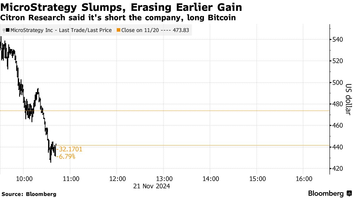 MicroStrategy (MSTR) 股票在Citron Research做空后下跌 - 彭博社