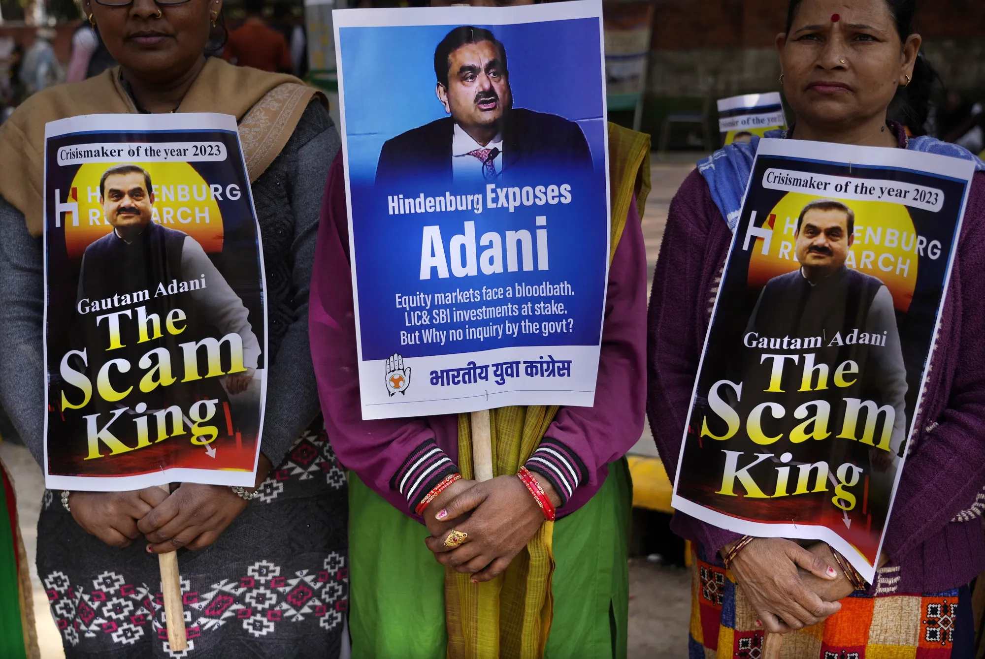 2023年2月,在新德里举行的抗议活动,要求对兴登堡研究的指控进行调查。摄影师:马尼什·斯瓦鲁普/AP 图片然后股票恢复,直到周三来自纽约东区的五项起诉使其再次下跌。根据 起诉书,在2020年至2024年期间,阿达尼和他的几名员工涉嫌隐瞒他们的欺诈行为,从美国投资者那里收集了数千万美元。检察官声称,阿达尼绿色能源有限公司的高管们制作了详细说明如何掩盖涉嫌贿赂的PowerPoint,贿赂承诺给安得拉邦的政府官员,以确保获得太阳能合同。美国执法部门表示,阿达尼在其中操控一切,他的个人财富曾使他成为亚洲首富。