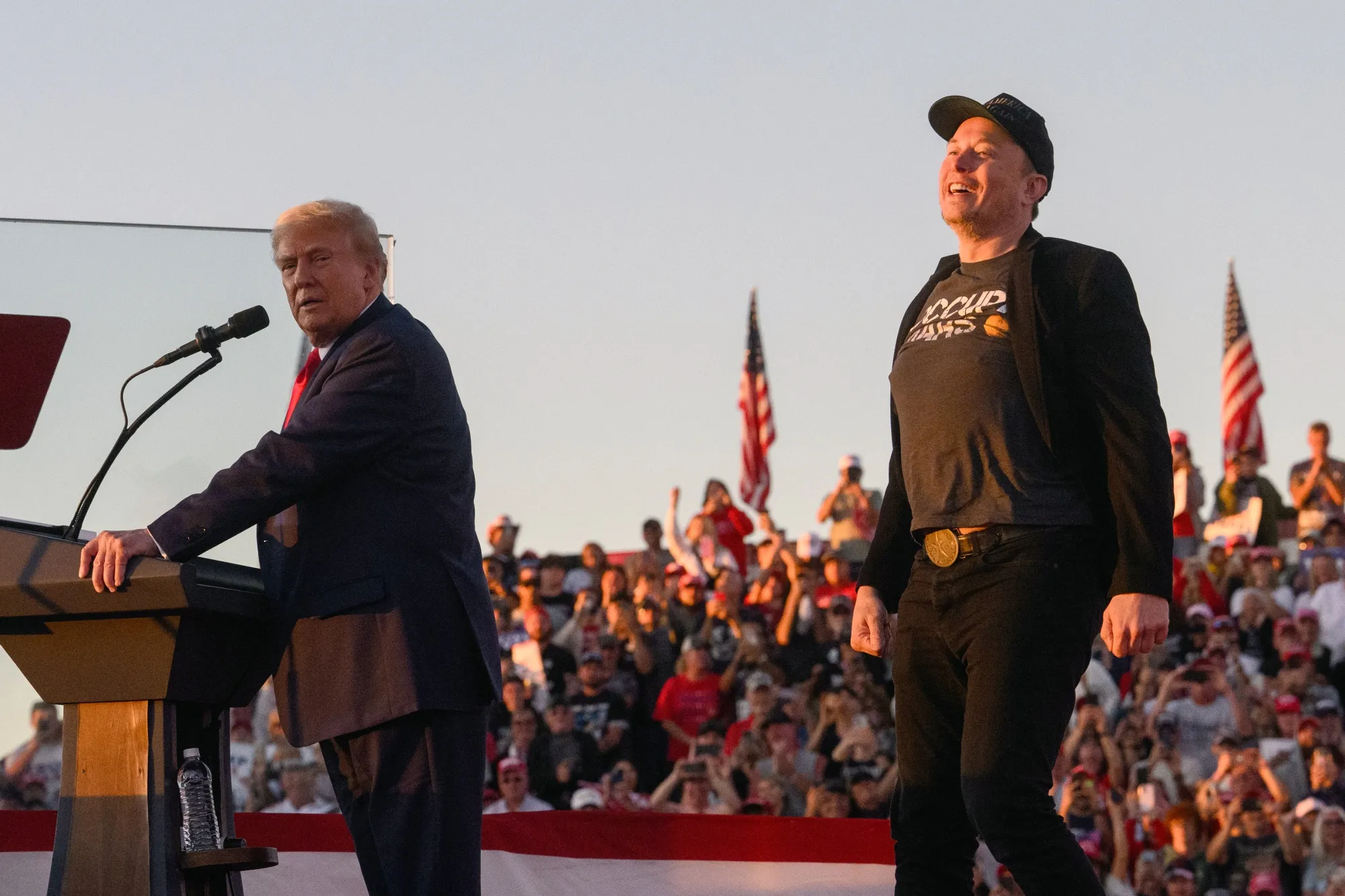 特斯拉公司首席执行官埃隆·马斯克(右)在2024年10月5日星期六于美国宾夕法尼亚州巴特勒的巴特勒农场展览会上与前美国总统唐纳德·特朗普同台参加竞选活动。