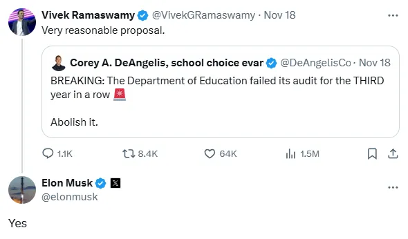 在他的竞选期间,当选总统唐纳德·特朗普多次承诺要取消美国教育部。他在一段 2023年9月的视频信息中表示,这样做将消除“浪费和腐败”,以及“在许多情况下仇恨我们孩子”的人,并将“所有教育工作和需求归还给各州。”在X平台上,维韦克·拉马斯瓦米和埃隆·马斯克,特朗普已委托他们负责新成立的政府效率咨询委员会, 支持这一计划。