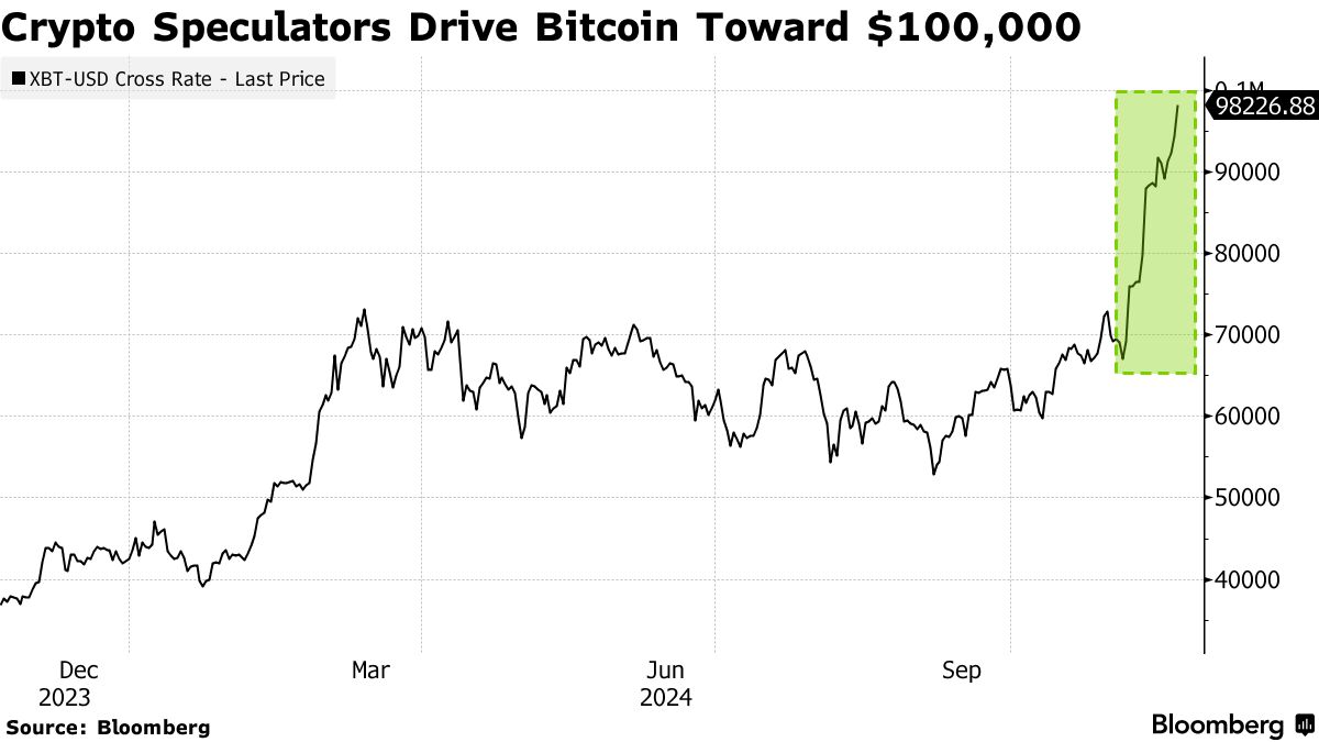 比特币创下新高,突破$98,000,因市场押注当选总统唐纳德·特朗普对加密货币的支持以及更宽松的监管环境将为该行业带来繁荣。一份福克斯商业新闻的报告指出,前商品期货交易委员会主席Chris Giancarlo被考虑作为新政府的首位“加密沙皇”。