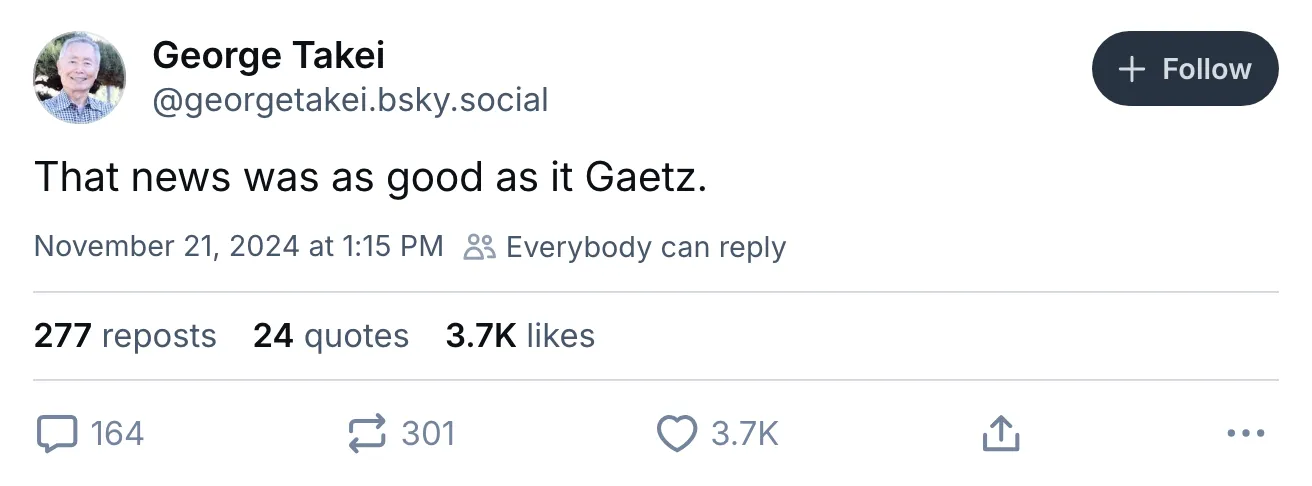三台电视悬挂在我办公室桌子左侧的天花板上。在正常的日子里,我会偶尔瞥一眼它们几次。今天不是正常的一天!每次我看时,字幕上都有一个新名字:一会儿是 比尔·黄。然后是 古塔姆·阿达尼。快速闪过 贾西·斯莫莱特。然后是 马特·盖茨,接着是 皮特·赫格塞斯,他很快被 加里·根斯勒取代,随后又被 再次取代为 本杰明·内塔尼亚胡。当 贾伊尔·博索纳罗 出现时,我已经完全脖子抽筋了。