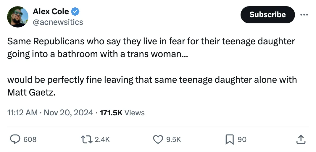 接下来谈谈马特·盖茨:在CNN的保拉·里德 通知这位前国会议员她知道关于 他与一名17岁少女的第二次性接触的消息后,45分钟内,他撤回了担任特朗普司法部长的提名。也许这意味着我们的民选官员 可以停止担心谁被允许进入女性浴室?