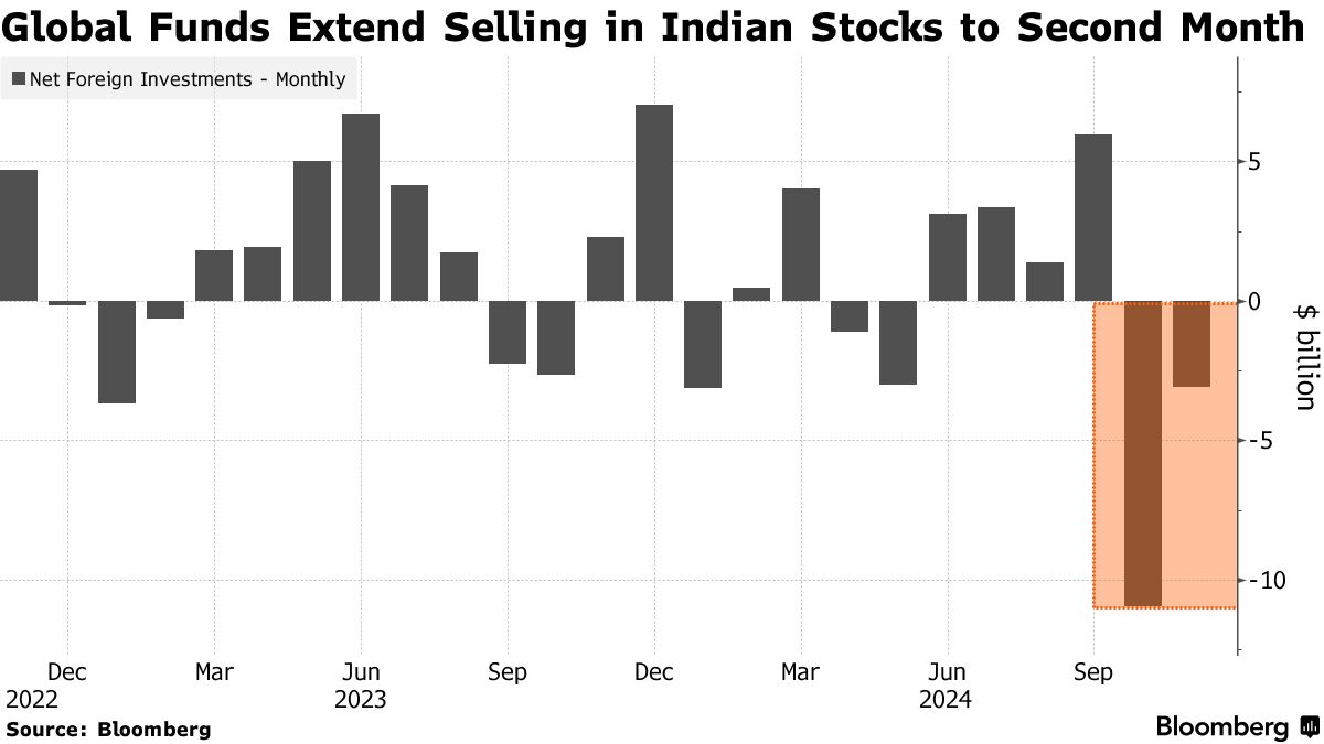 Nifty 50 指数自九月底创下历史新高以来,因 外资流出和高盛集团及花旗集团等一系列评级下调而回落约 11%。最初作为“卖印度,买中国”的交易,现在引发了对经济增长放缓、顽固通胀和消费需求降温的担忧。