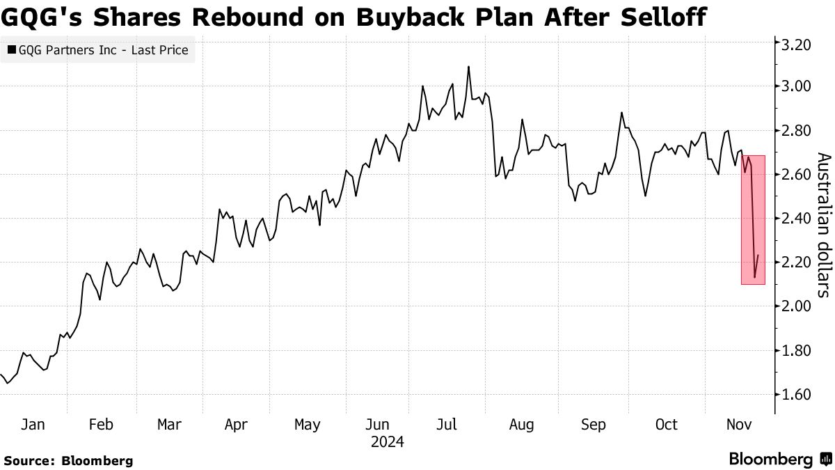 回购计划使GQG的股票在周五上涨了最多16%,但随后回落了一些涨幅,仍然低于前一天的损失。
