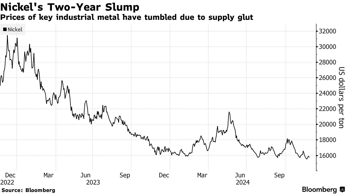 镍用于制造不锈钢和电动车电池,由于需求疲软和印度尼西亚供应激增,已经经历了两年的低迷。这迫使其他国家的一些生产商完全停产,也给已经因短缺而面临高矿石价格的东南亚国家的冶炼厂带来了压力。