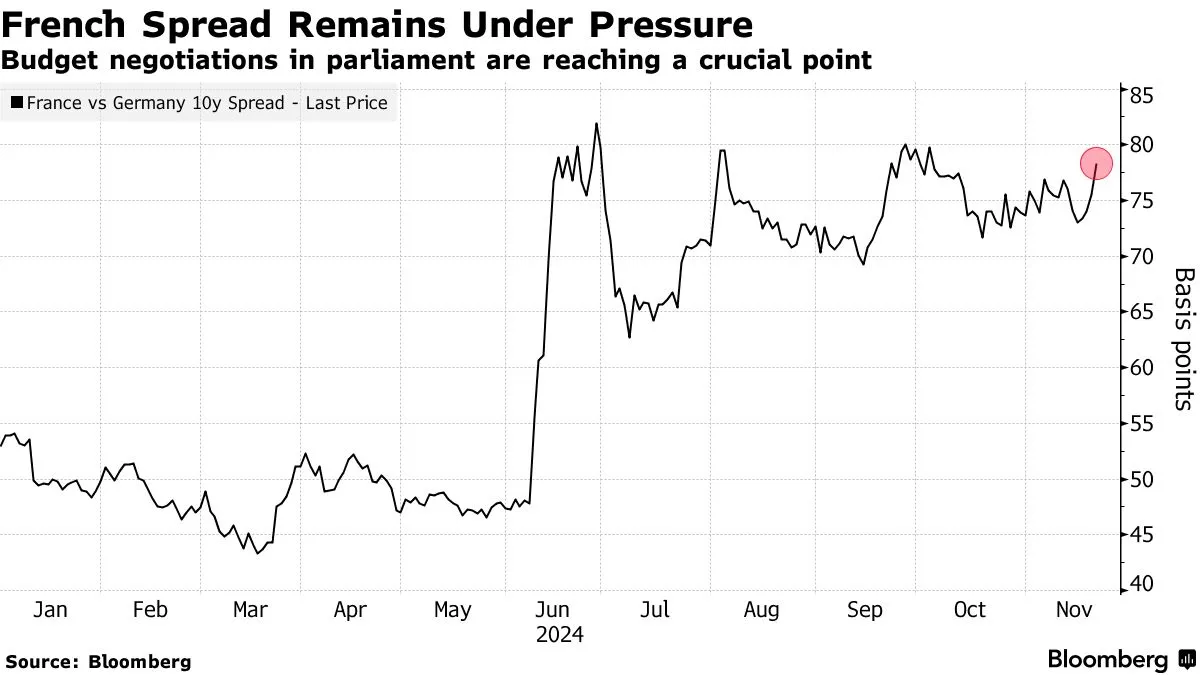 市场对法国的预算谈判和其主权**评级的审查感到担忧,债券风险飙升至一个月来的最高点。最新的动态反映了人们对极右翼领导人玛丽娜·勒庞是否可能支持一项可能推翻米歇尔·巴尔尼耶政府并破坏其2025年预算计划的不信任动议的担忧。该国昨天还出售了更多债券,其沉重的债务负担将面临持续的审查。