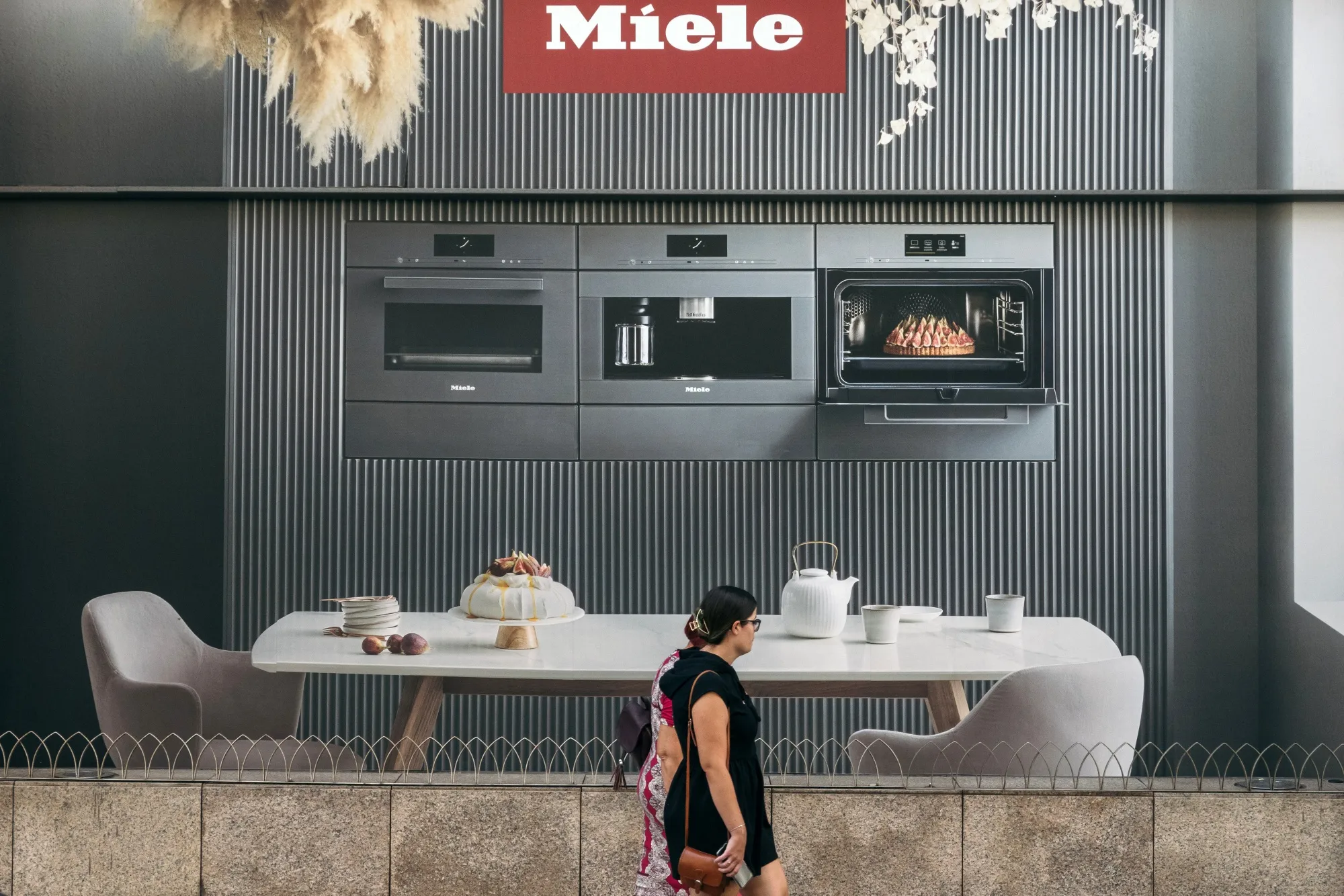 行人经过2022年布加勒斯特的美诺(Miele & Cie KG)广告,作为该国经济发展的典范。